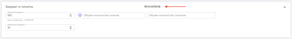 Для удобства управления кампанией рядом с лимитом по общему бюджету в скобках указано количество израсходованных средств на данный момент:
