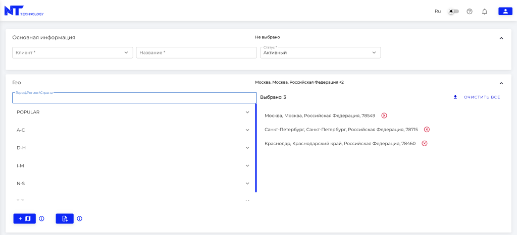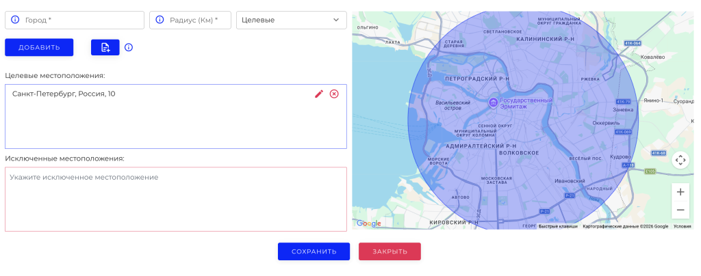 Настроенный регион и радиус отобразится в разделе местоположений, в зависимости от типа (целевые, исключения). Если произойдет их пересечение, то населенные пункты, попавшие в эту область, будут расцениваться системой как исключенные.