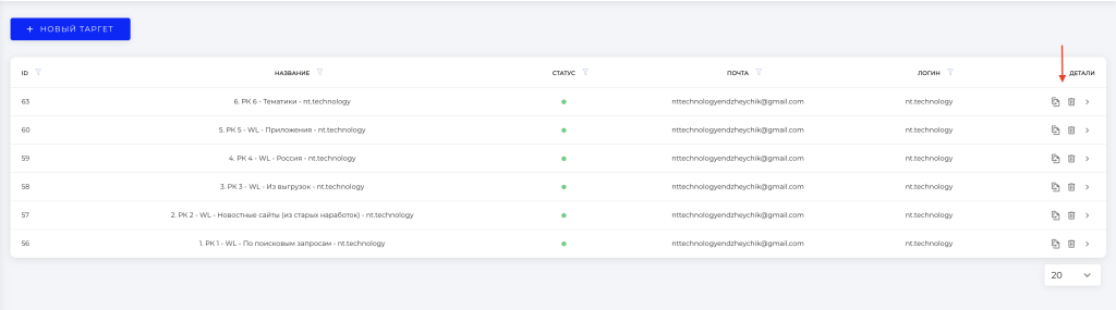 • В разделе бокового меню «Таргет» нажмите кнопку «Новый таргет».​