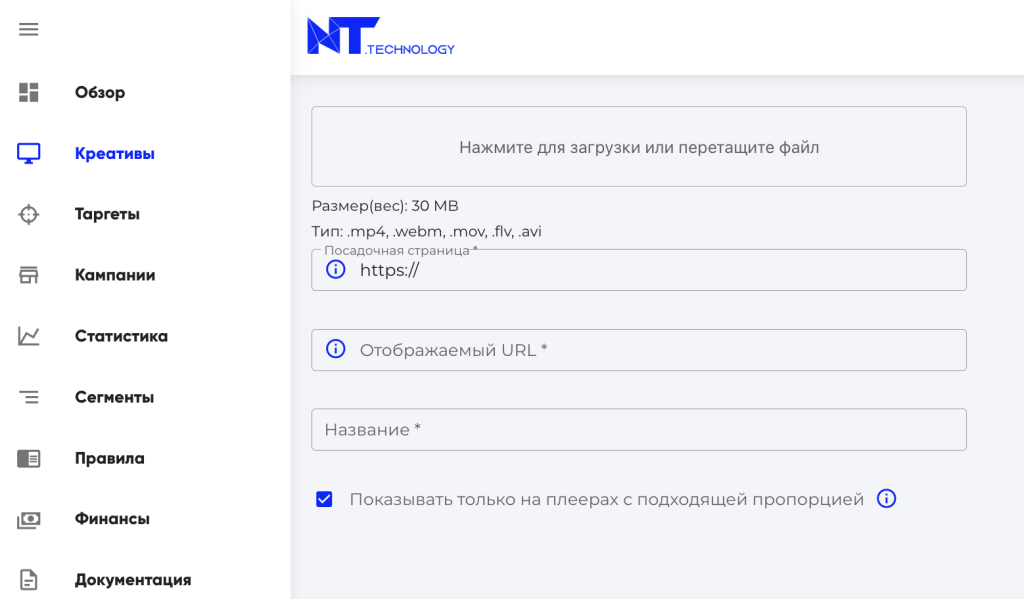 По умолчанию на платформе загружаемое видео показывается в любых доступных плеерах с разными пропорциями (вертикальной, квадратной). Если необходимо показывать рекламный видеоролик только на плеерах с подходящей пропорцией (например, 16:9, 4:3 и т.п.), необходимо установить галочку в пункте «Показывать только на плеерах с подходящей пропорцией».